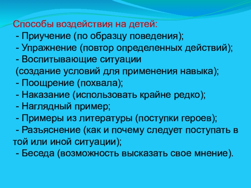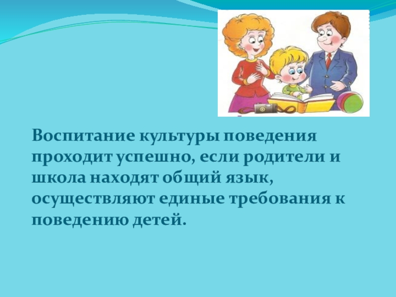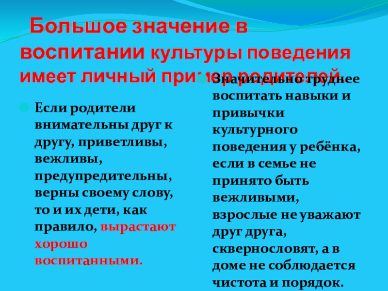Значительно труднее воспитать навыки и привычки культурного поведения у ребёнка, если в семье не принято быть вежливыми, взрослые не уважают друг друга, сквернословят, а в доме не соблюдается чистота и порядок.