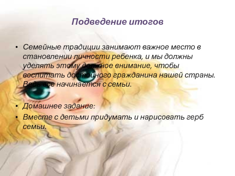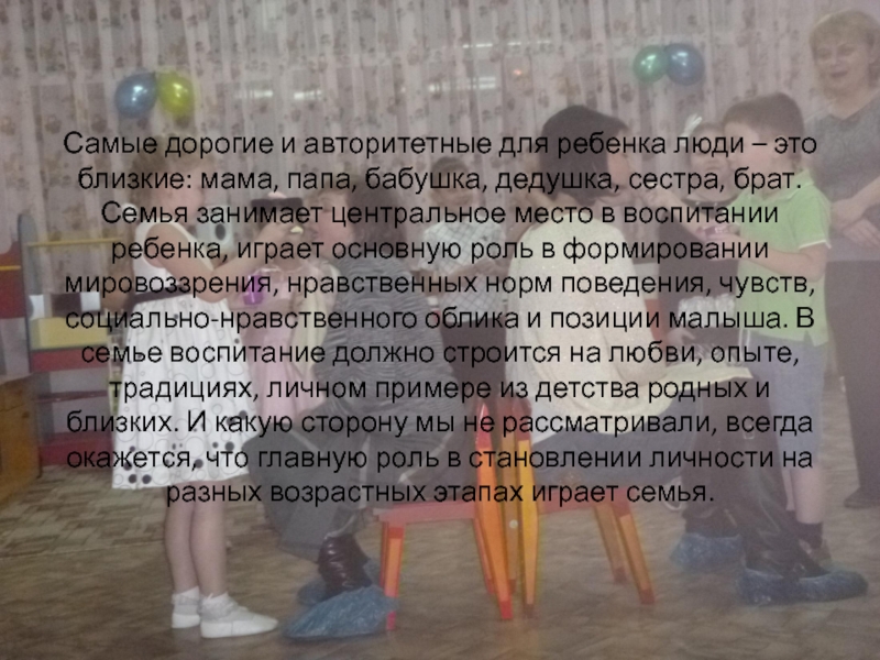 Здесь пробуждаются и начинают развертываться дремлющие силы детской души: здесь ребенок учится любить и, жертвовать, здесь слагаются первые основы его характера, его будущего счастья, здесь ребенок становится маленьким человечком, из которого потом разовьется великая личность или может быть низкий проходимец» Философ И.А.Ильин.