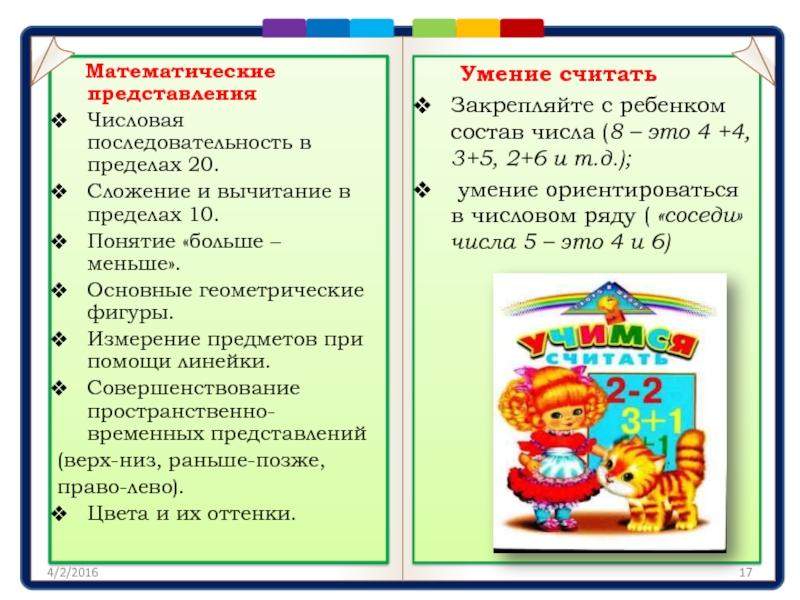 умение ориентироваться в числовом ряду ( «соседи» числа 5 – это 4 и 6)