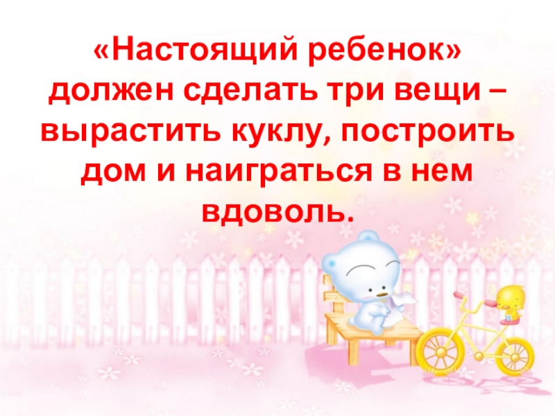 Слайд 31«Настоящий ребенок» должен сделать три вещи – вырастить куклу, построить дом