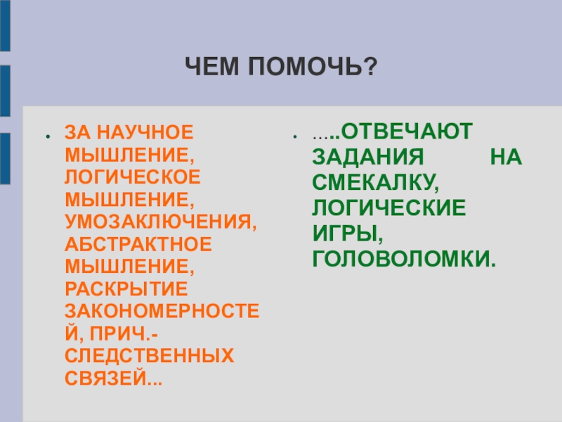 …..ОТВЕЧАЮТ ЗАДАНИЯ НА СМЕКАЛКУ, ЛОГИЧЕСКИЕ ИГРЫ, ГОЛОВОЛОМКИ.