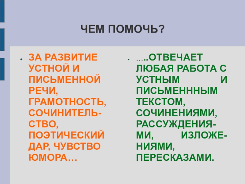 …..ОТВЕЧАЕТ ЛЮБАЯ РАБОТА С УСТНЫМ И ПИСЬМЕНННЫМ ТЕКСТОМ, СОЧИНЕНИЯМИ, РАССУЖДЕНИЯ-МИ, ИЗЛОЖЕ-НИЯМИ, ПЕРЕСКАЗАМИ.
