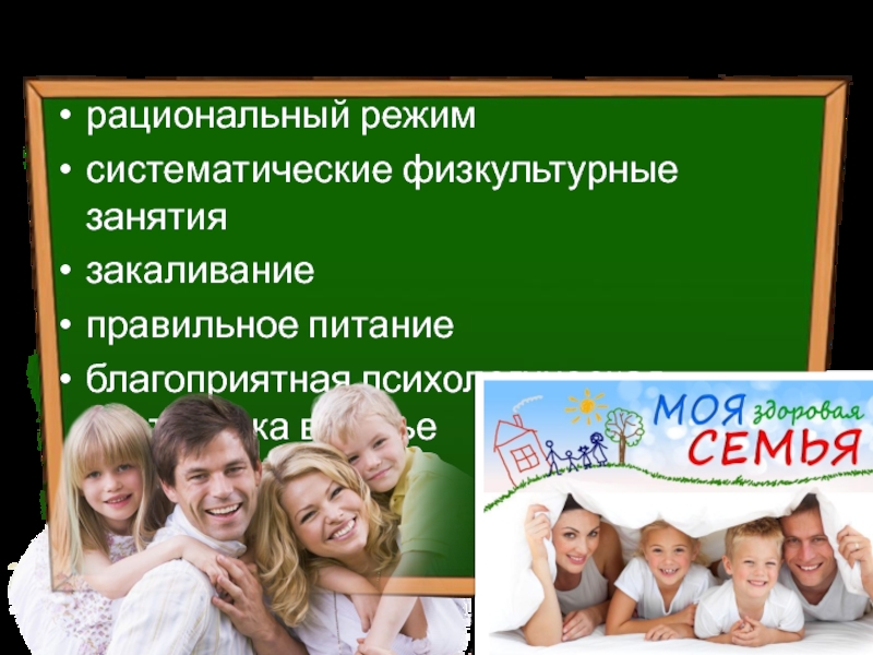 Основные компоненты: рациональный режимсистематические физкультурные занятия закаливаниеправильное питаниеблагоприятная психологическая обстановка в семье