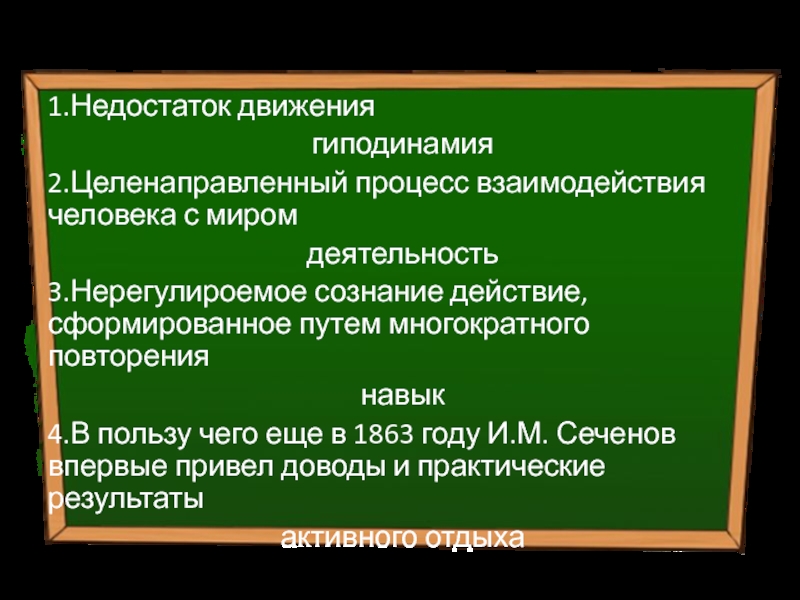 Тема 3. Двигательная активность 1.Недостаток движения гиподинамия2.Целенаправленный процесс взаимодействия человека с миром деятельность3.Нерегулироемое сознание действие, сформированное путем