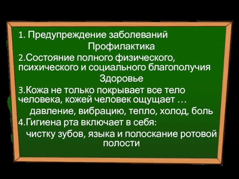Тема 1. Личная гигиена. 1. Предупреждение заболеваний Профилактика2.Состояние полного физического, психического и социального благополучия Здоровье3.Кожа не только