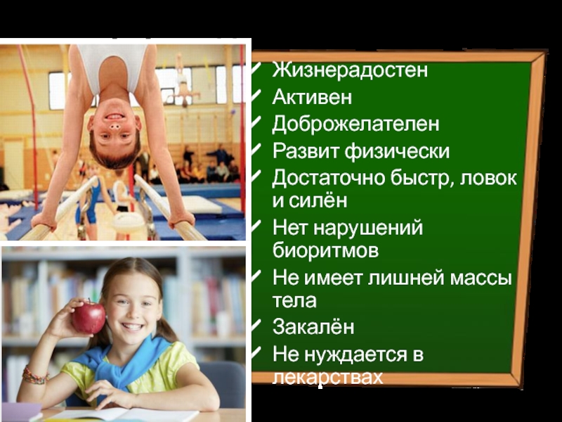 Портрет здорового ребёнкаЖизнерадостенАктивенДоброжелателенРазвит физическиДостаточно быстр, ловок и силёнНет нарушений биоритмовНе имеет лишней массы телаЗакалёнНе нуждается в лекарствах