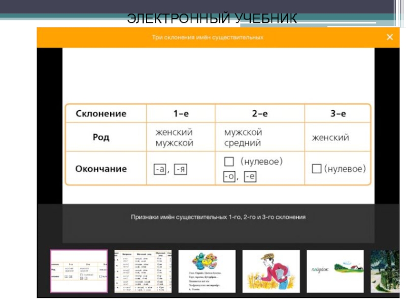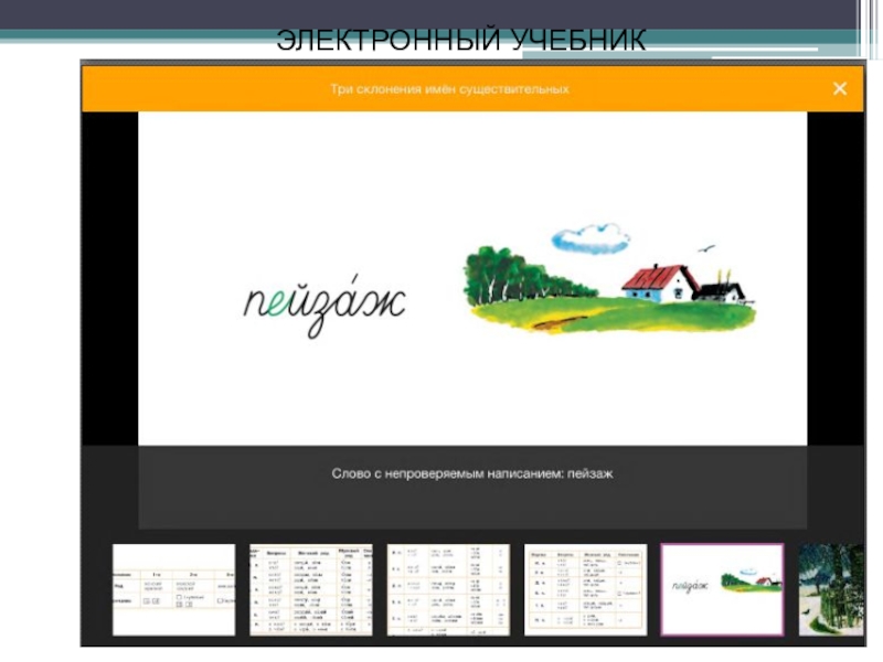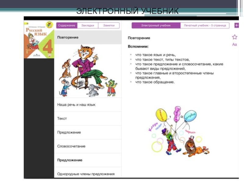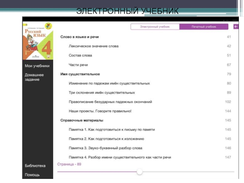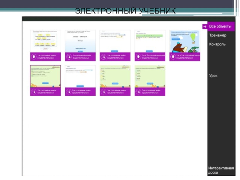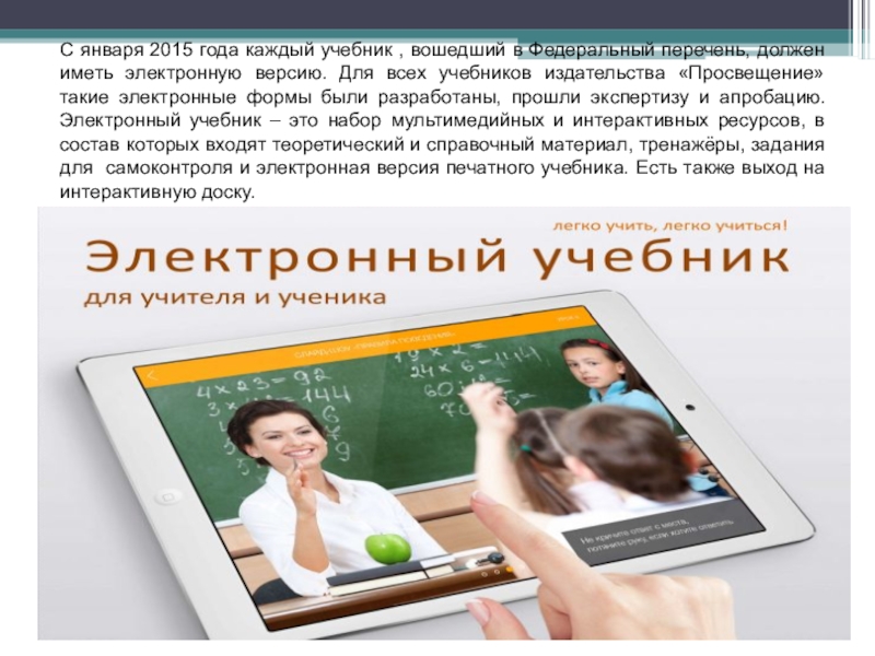 перечень, должен иметь электронную версию. Для всех учебников издательства «Просвещение» такие электронные формы были разработаны, прошли экспертизу и апробацию. Электронный учебник – это набор мультимедийных и интерактивных ресурсов, в состав которых входят теоретический и справочный материал, тренажёры, задания для самоконтроля и электронная версия печатного учебника. Есть также выход на интерактивную доску.