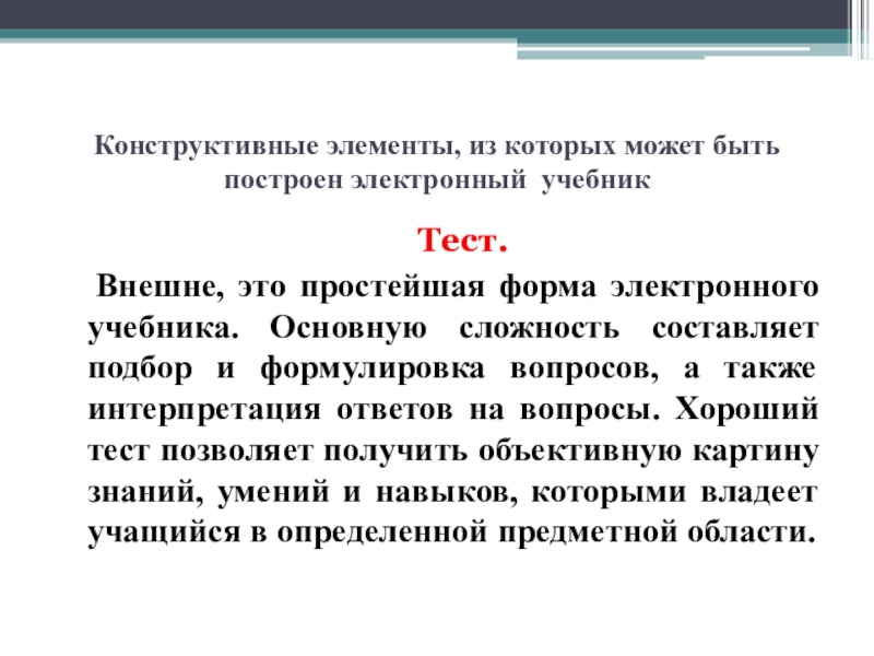 это простейшая форма электронного учебника. Основную сложность составляет подбор и формулировка вопросов, а также интерпретация ответов на вопросы. Хороший тест позволяет получить объективную картину знаний, умений и навыков, которыми владеет учащийся в определенной предметной области.