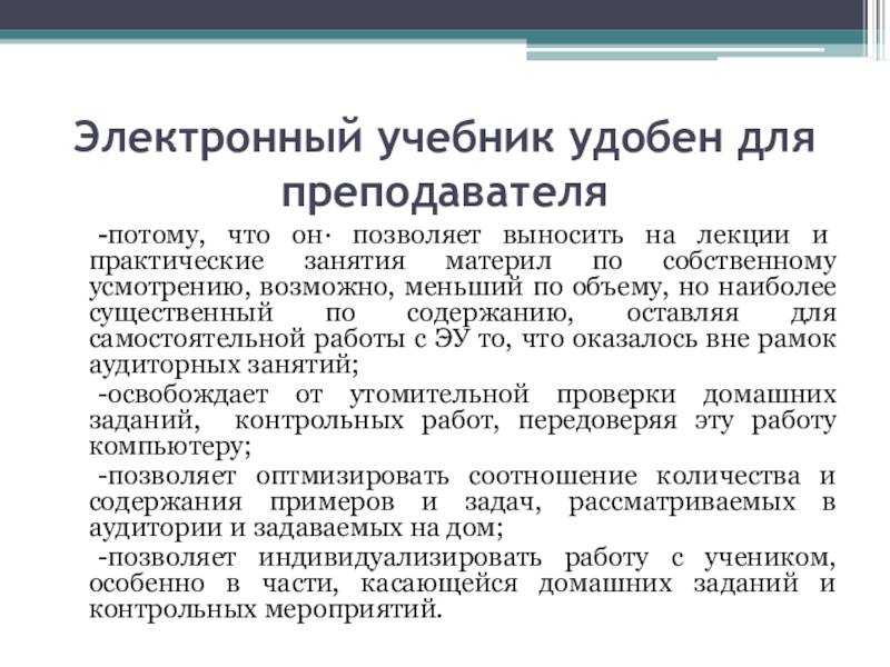 -позволяет индивидуализировать работу с учеником, особенно в части, касающейся домашних заданий и контрольных мероприятий.