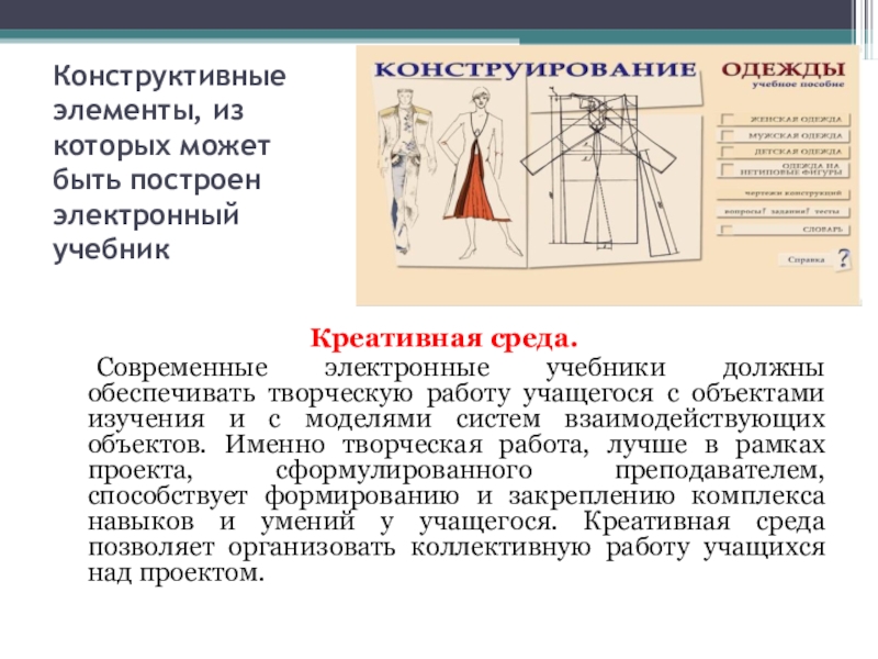 электронные учебники должны обеспечивать творческую работу учащегося с объектами изучения и с моделями систем взаимодействующих объектов. Именно творческая работа, лучше в рамках проекта, сформулированного преподавателем, способствует формированию и закреплению комплекса навыков и умений у учащегося. Креативная среда позволяет организовать коллективную работу учащихся над проектом.