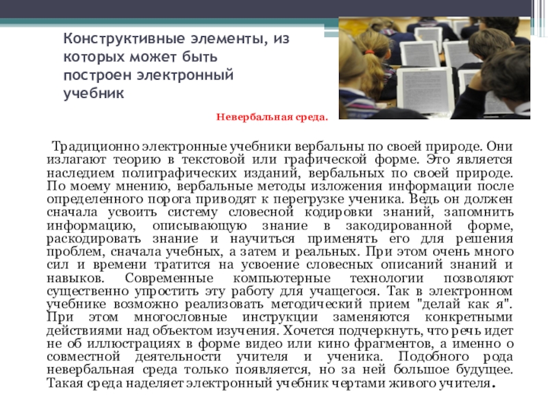 учебники вербальны по своей природе. Они излагают теорию в текстовой или графической форме. Это является наследием полиграфических изданий, вербальных по своей природе. По моему мнению, вербальные методы изложения информации после определенного порога приводят к перегрузке ученика. Ведь он должен сначала усвоить систему словесной кодировки знаний, запомнить информацию, описывающую знание в закодированной форме, раскодировать знание и научиться применять его для решения проблем, сначала учебных, а затем и реальных. При этом очень много сил и времени тратится на усвоение словесных описаний знаний и навыков. Современные компьютерные технологии позволяют существенно упростить эту работу для учащегося. Так в электронном учебнике возможно реализовать методический прием "делай как я". При этом многословные инструкции заменяются конкретными действиями над объектом изучения. Хочется подчеркнуть, что речь идет не об иллюстрациях в форме видео или кино фрагментов, а именно о совместной деятельности учителя и ученика. Подобного рода невербальная среда только появляется, но за ней большое будущее. Такая среда наделяет электронный учебник чертами живого учителя.