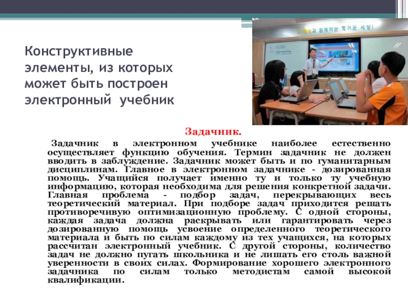 учебнике наиболее естественно осуществляет функцию обучения. Термин задачник не должен вводить в заблуждение. Задачник может быть и по гуманитарным дисциплинам. Главное в электронном задачнике - дозированная помощь. Учащийся получает именно ту и только ту учебную информацию, которая необходима для решения конкретной задачи. Главная проблема - подбор задач, перекрывающих весь теоретический материал. При подборе задач приходится решать противоречивую оптимизационную проблему. С одной стороны, каждая задача должна раскрывать или гарантировать через дозированную помощь усвоение определенного теоретического материала и быть по силам каждому из тех учащихся, на которых рассчитан электронный учебник. С другой стороны, количество задач не должно пугать школьника и не лишать его столь важной уверенности в своих силах. Формирование хорошего электронного задачника по силам только методистам самой высокой квалификации.