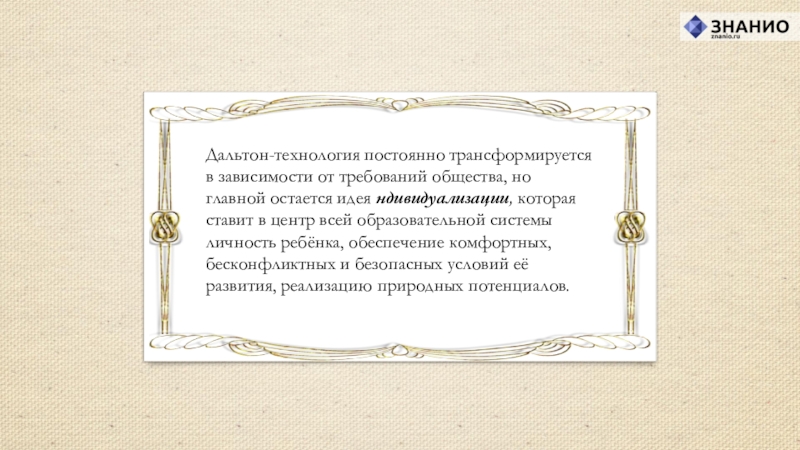 идея ндивидуализации, которая ставит в центр всей образовательной системы личность ребёнка, обеспечение комфортных, бесконфликтных и безопасных условий её развития, реализацию природных потенциалов.