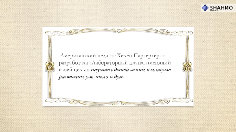 Американский педагог Хелен Паркерхерст разработала «Лабораторный план», имеющий своей целью научить