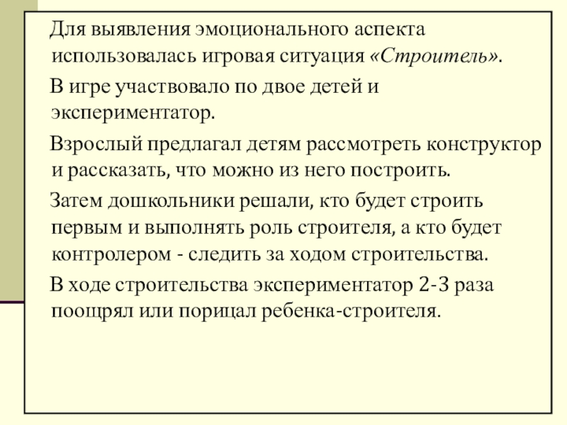 Слайд 14 Для выявления эмоционального аспекта использовалась игровая ситуация «Строитель».