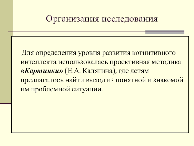 интеллекта использовалась проективная методика «Картинки» (Е.А. Калягина), где детям предлагалось найти выход из понятной и знакомой им проблемной ситуации.