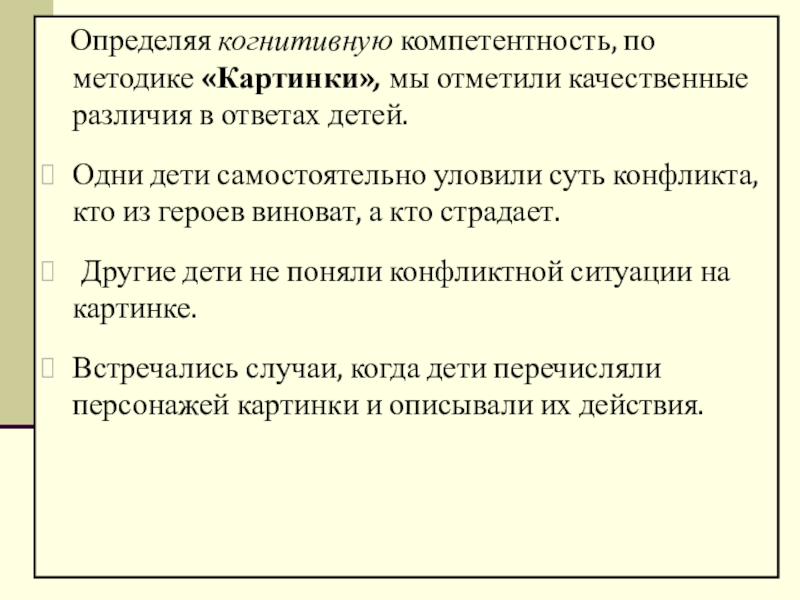 Слайд 15 Определяя когнитивную компетентность, по методике «Картинки», мы отметили качественные