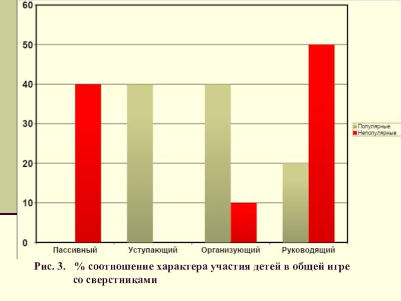 Слайд 24Рис. 3. % соотношение характера участия детей в общей игре