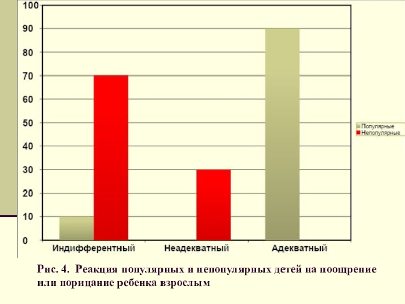 Слайд 38Рис. 4. Реакция популярных и непопулярных детей на поощрение или порицание