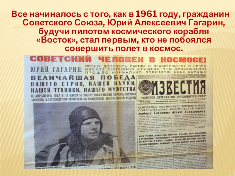 Все начиналось с того, как в 1961 году, гражданин Советского Союза, Юрий Алексеевич Гагарин, будучи пилотом космического