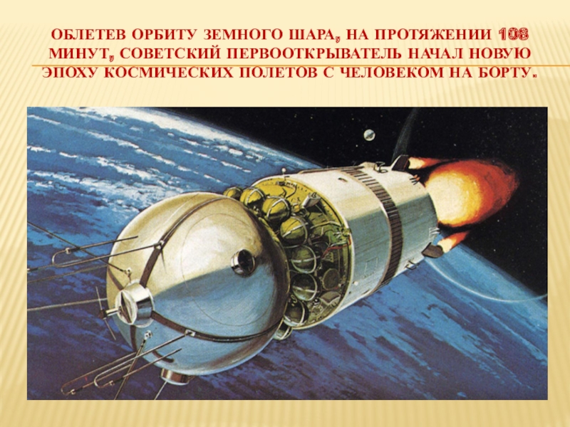 Слайд 3 Облетев орбиту Земного шара, на протяжении 108 минут, советский первооткрыватель начал