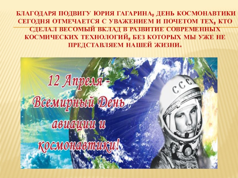 Слайд 6 Благодаря подвигу Юрия Гагарина, День космонавтики сегодня отмечается с уважением и