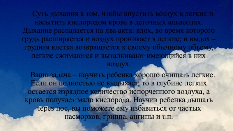 Ваша задача – научить ребенка хорошо очищать легкие. Если он полностью не выдыхает, то в глубине легких остается изрядное количество испорченного воздуха, а кровь получает мало кислорода. Научив ребенка дышать через нос, вы поможете ему избавиться от частых насморков, гриппа, ангины и т.п.