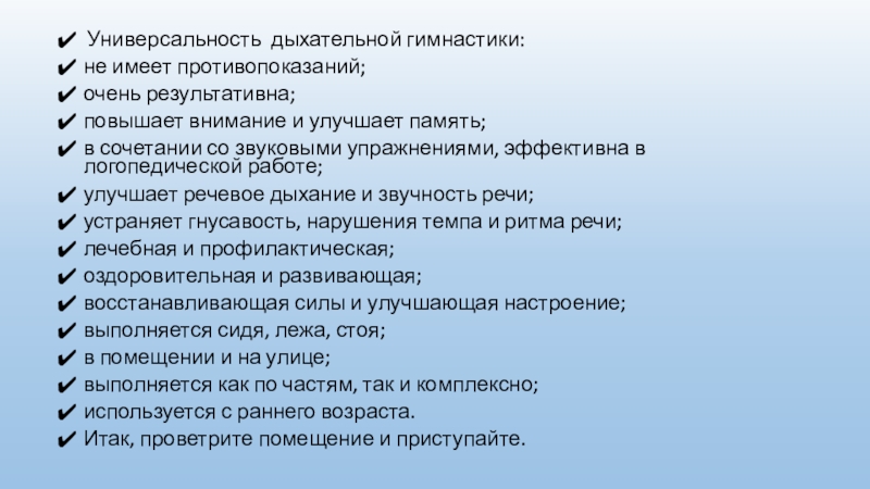 Слайд 9 Универсальность дыхательной гимнастики: