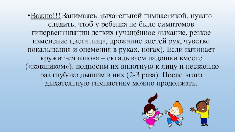 Слайд 7Важно!!! Занимаясь дыхательной гимнастикой, нужно следить, чтоб у ребенка не было симптомов