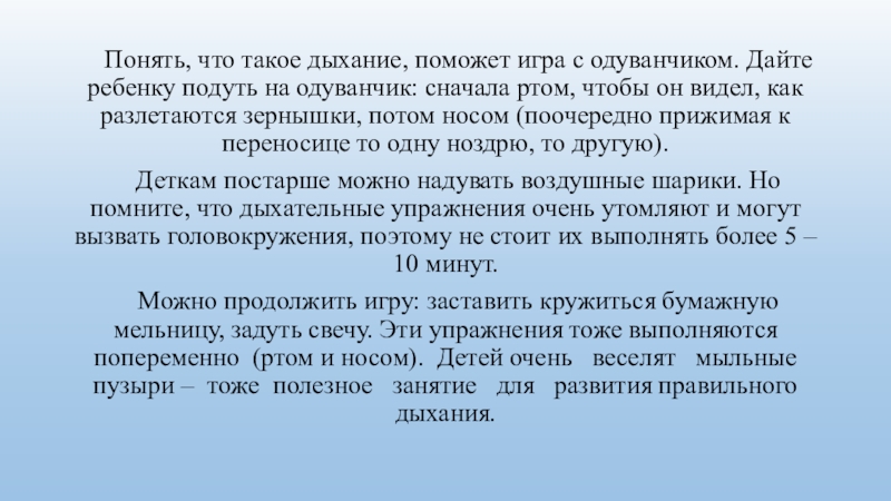 Слайд 5 Понять, что такое дыхание, поможет игра с одуванчиком. Дайте