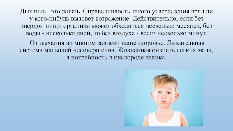 Слайд 2Дыхание - это жизнь. Справедливость такого утверждения вряд ли у кого-нибудь вызовет возражение.