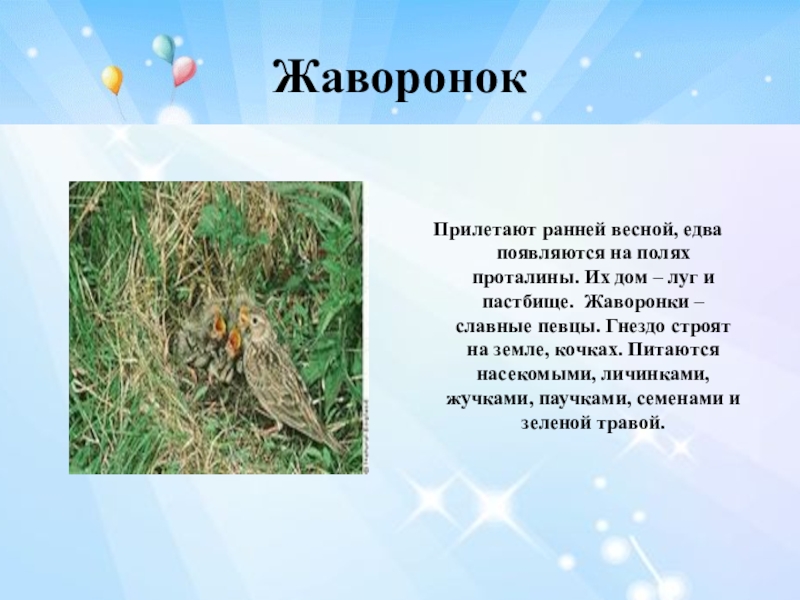 Прилетают ранней весной, едва появляются на полях проталины. Их дом –