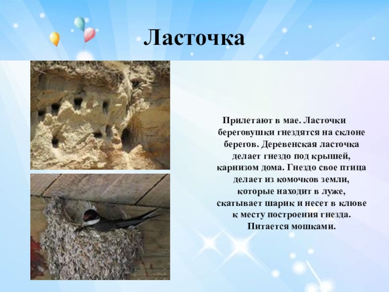 Прилетают в мае. Ласточки береговушки гнездятся на склоне берегов. Деревенская ласточка