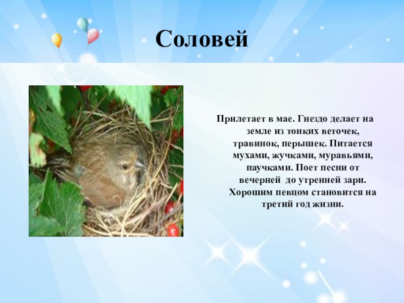 перышек. Питается мухами, жучками, муравьями, паучками. Поет песни от вечерней до утренней зари. Хорошим певцом становится на третий год жизни.