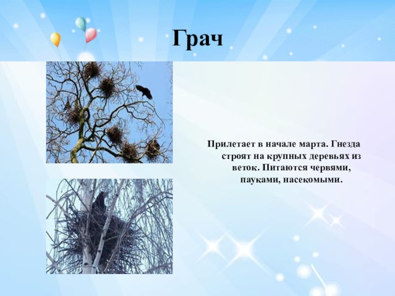 Прилетает в начале марта. Гнезда строят на крупных деревьях из веток.