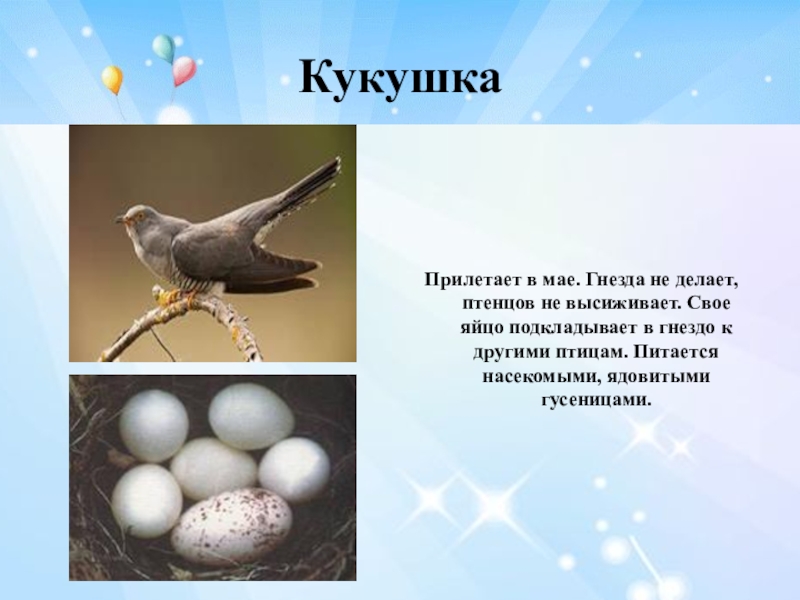 Прилетает в мае. Гнезда не делает, птенцов не высиживает. Свое яйцо