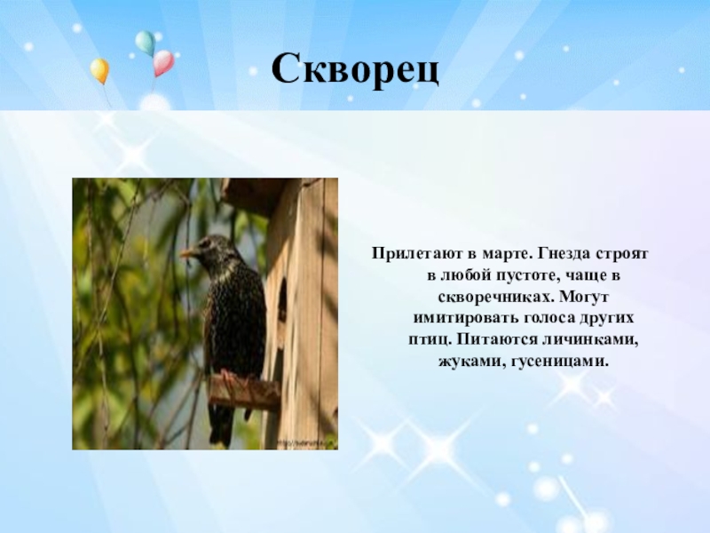 Прилетают в марте. Гнезда строят в любой пустоте, чаще в скворечниках.