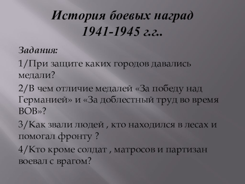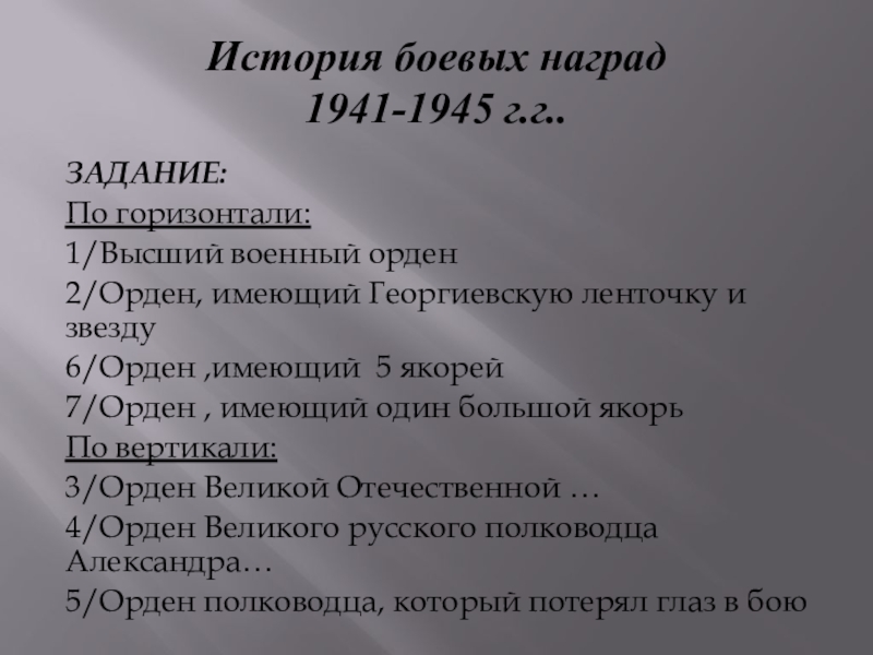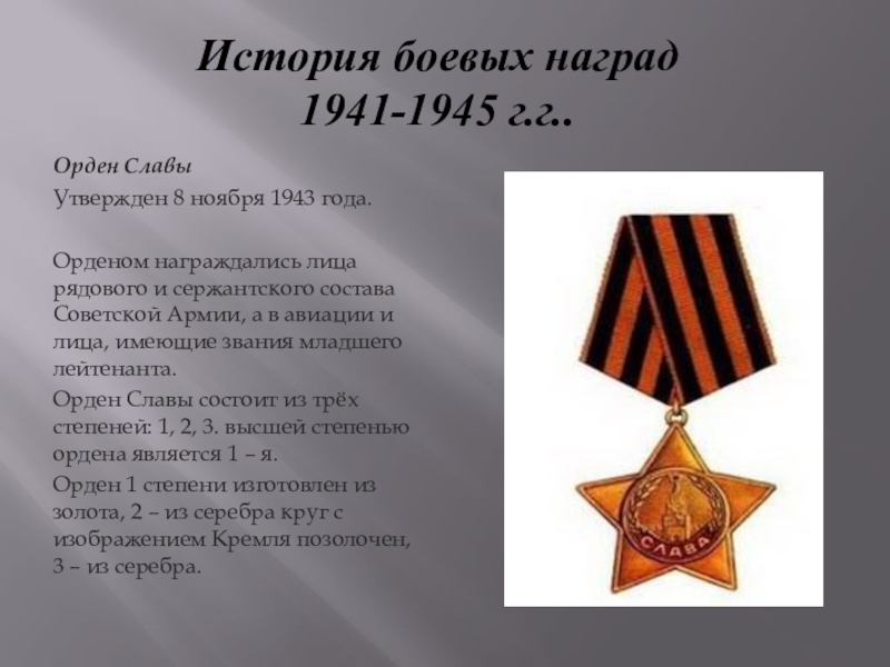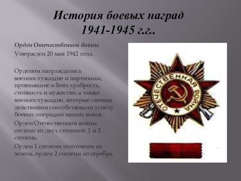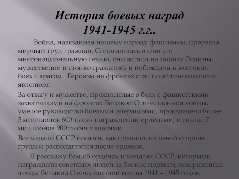 Я расскажу Вам об орденах и медалях СССР, которыми награждали советских людей за боевые подвиги, совершенные в годы Великой Отечественной войны 1941 – 1945 годов.