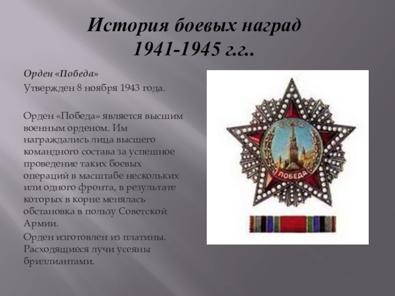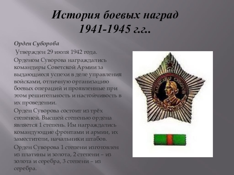 высшим военным орденом. Им награждались лица высшего командного состава за успешное проведение таких боевых операций в масштабе нескольких или одного фронта, в результате которых в корне менялась обстановка в пользу Советской Армии.
