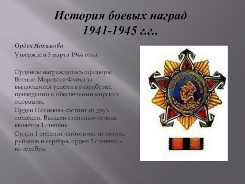 Орден Нахимова состоит из двух степеней. Высшей степенью ордена является 1 степень.