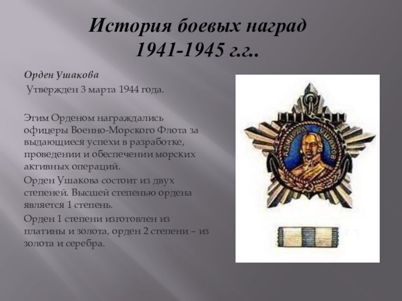 Орден Ушакова состоит из двух степеней. Высшей степенью ордена является 1 степень.