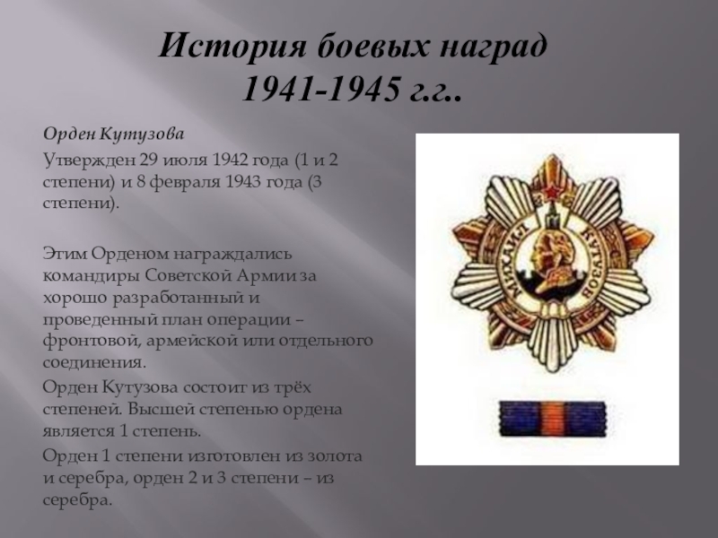 Этим Орденом награждались командиры Советской Армии за хорошо разработанный и проведенный план операции – фронтовой, армейской или отдельного соединения.