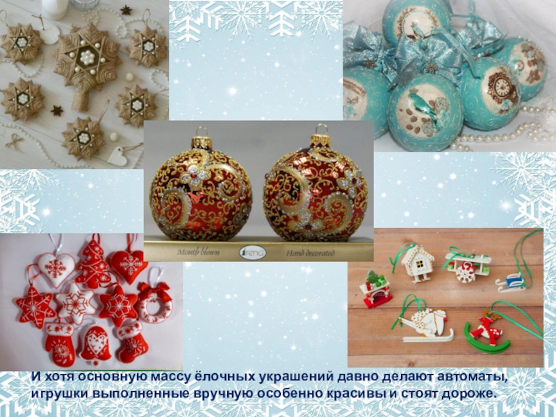 Слайд 10И хотя основную массу ёлочных украшений давно делают автоматы, игрушки выполненные