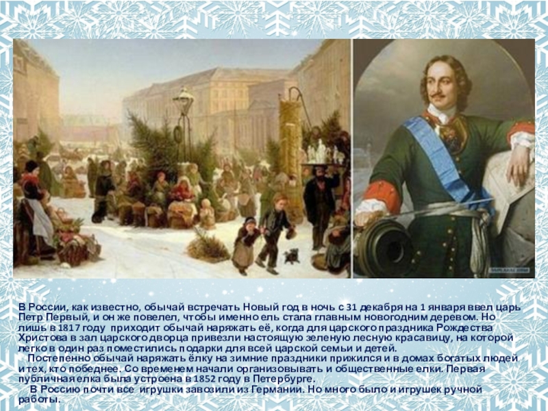 31 декабря на 1 января ввел царь Петр Первый, и он же повелел, чтобы именно ель стала главным новогодним деревом. Но лишь в 1817 году приходит обычай наряжать её, когда для царского праздника Рождества Христова в зал царского дворца привезли настоящую зеленую лесную красавицу, на которой легко в один раз поместились подарки для всей царской семьи и детей.