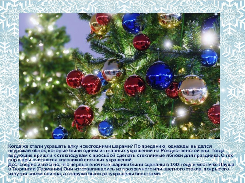 Слайд 3Когда же стали украшать елку новогодними шарами? По преданию, однажды выдался