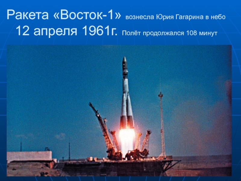 Ракета «Восток-1» вознесла Юрия Гагарина в небо   12 апреля 1961г. Полёт продолжался 108 минут