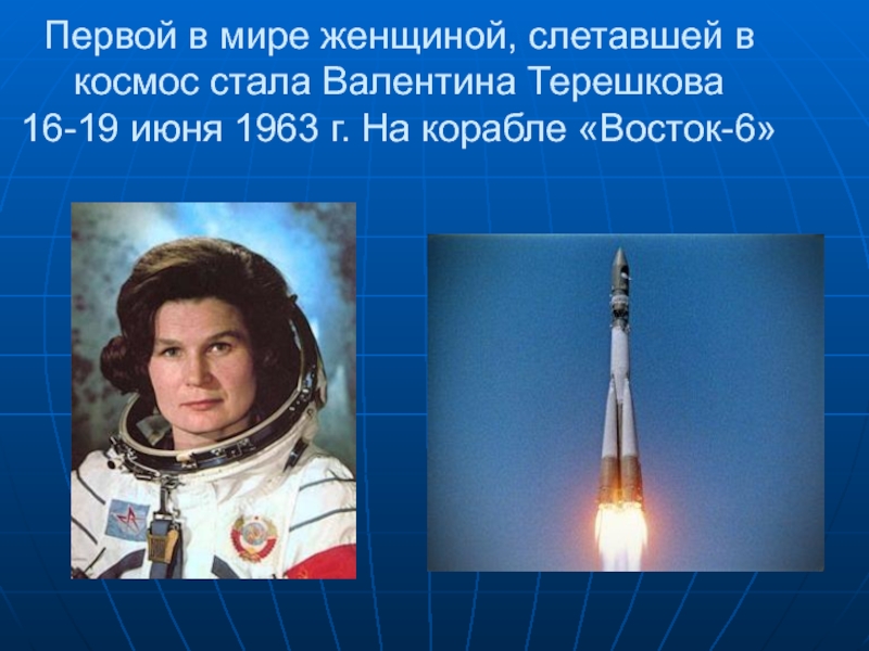 Первой в мире женщиной, слетавшей в космос стала Валентина Терешкова  16-19 июня 1963 г. На корабле