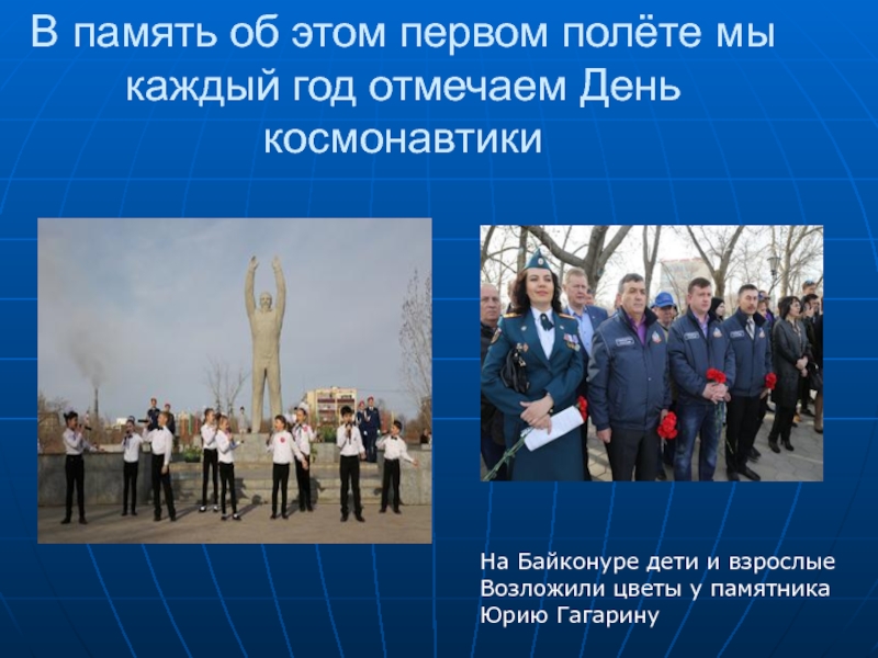 В память об этом первом полёте мы каждый год отмечаем День космонавтикиНа Байконуре дети и взрослые Возложили