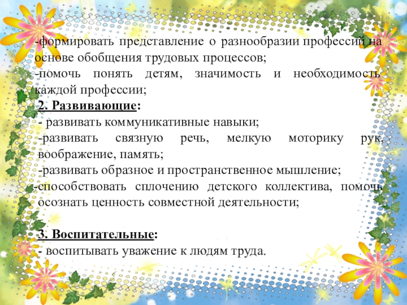 -формировать представление о разнообразии профессий на основе обобщения трудовых процессов;