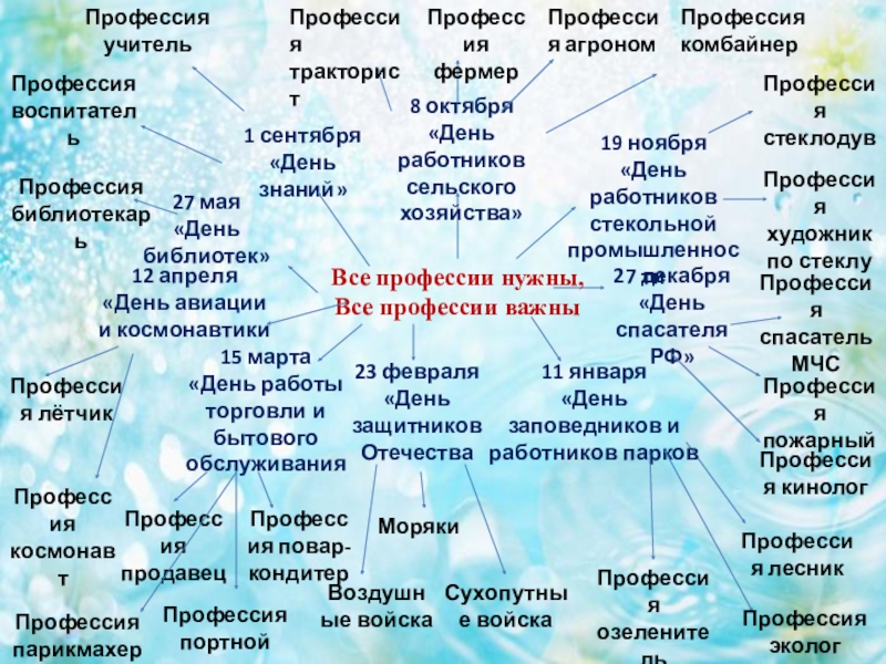 Беседы по ознакомлению детей с профессиями по профессиональным праздникам в каждом месяце;